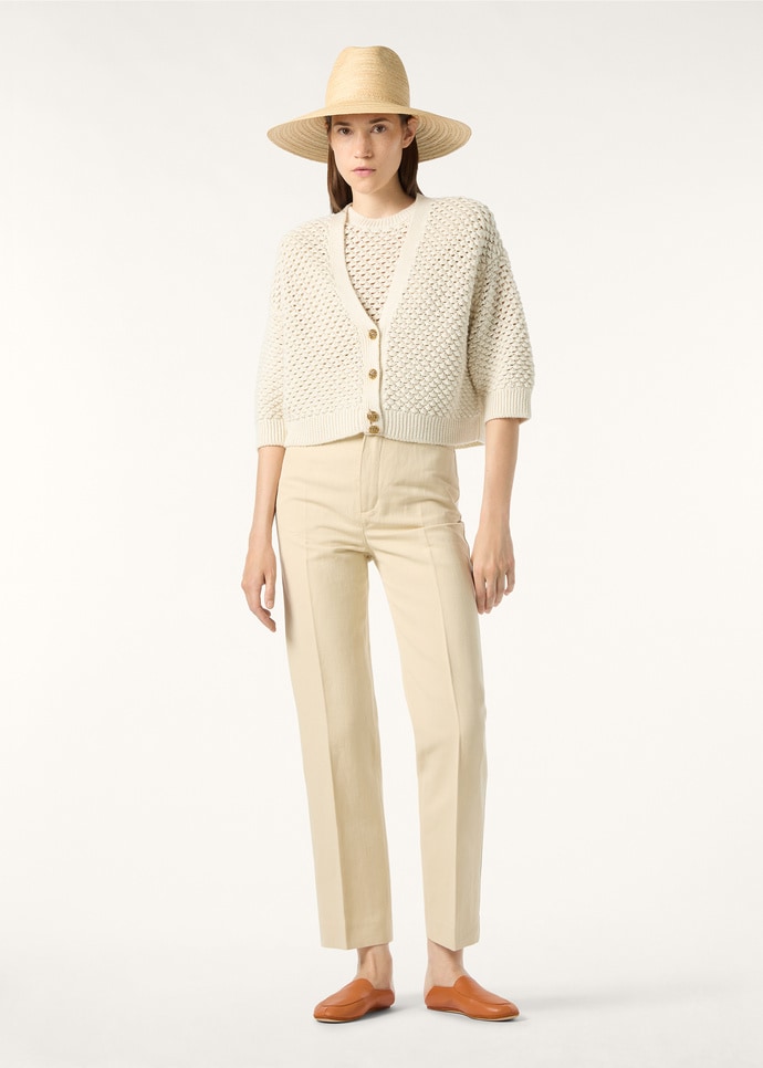 Infused with rich tactility, the Ginko cardigan is carefully worked with a delicate popcorn stitch for a refined openwork effect. In linen, cashmere, and silk, it is shaped to have a slightly boxy profile, complete with a V-neck and cropped sleeves. A row of gleaming buttons runs down the front for a signature finish.