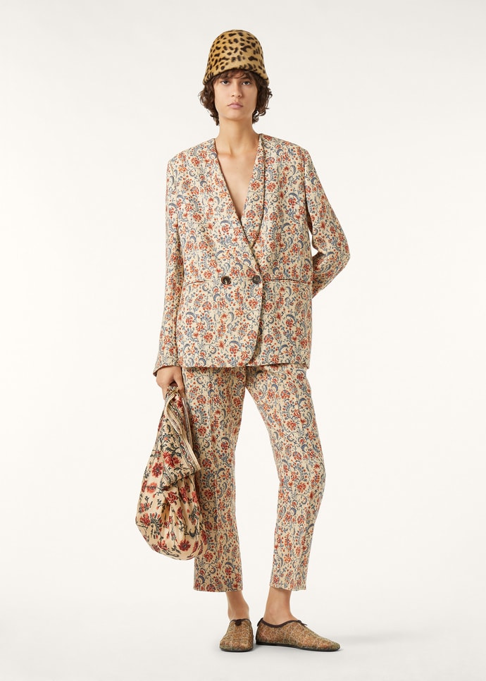 Fusing versatility with understated style, the Dermot pants are rendered in a light linen crepe natté, adorned with the painterly Jasmine Blooms print. They are cut to a cropped silhouette with a sharp front crease. Discreet fastenings and diagonal side pockets elevate the classic design with practical refinement.